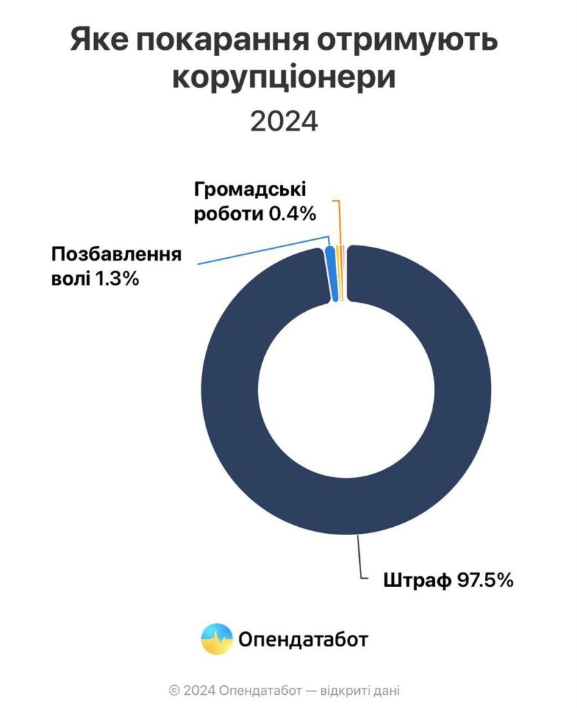 Повідомляється, що від початку повномасштабної війни і до кінця жовтня українські суди винесли 6877 вироків за скоєння корупційних злочинів. У поточному судді призначили покарання у вигляді позбавлення волі лише у 1,5% випадків, а у 97,5% випадків корупціонери відбулися “легким переляком” та заплатили штрафи.